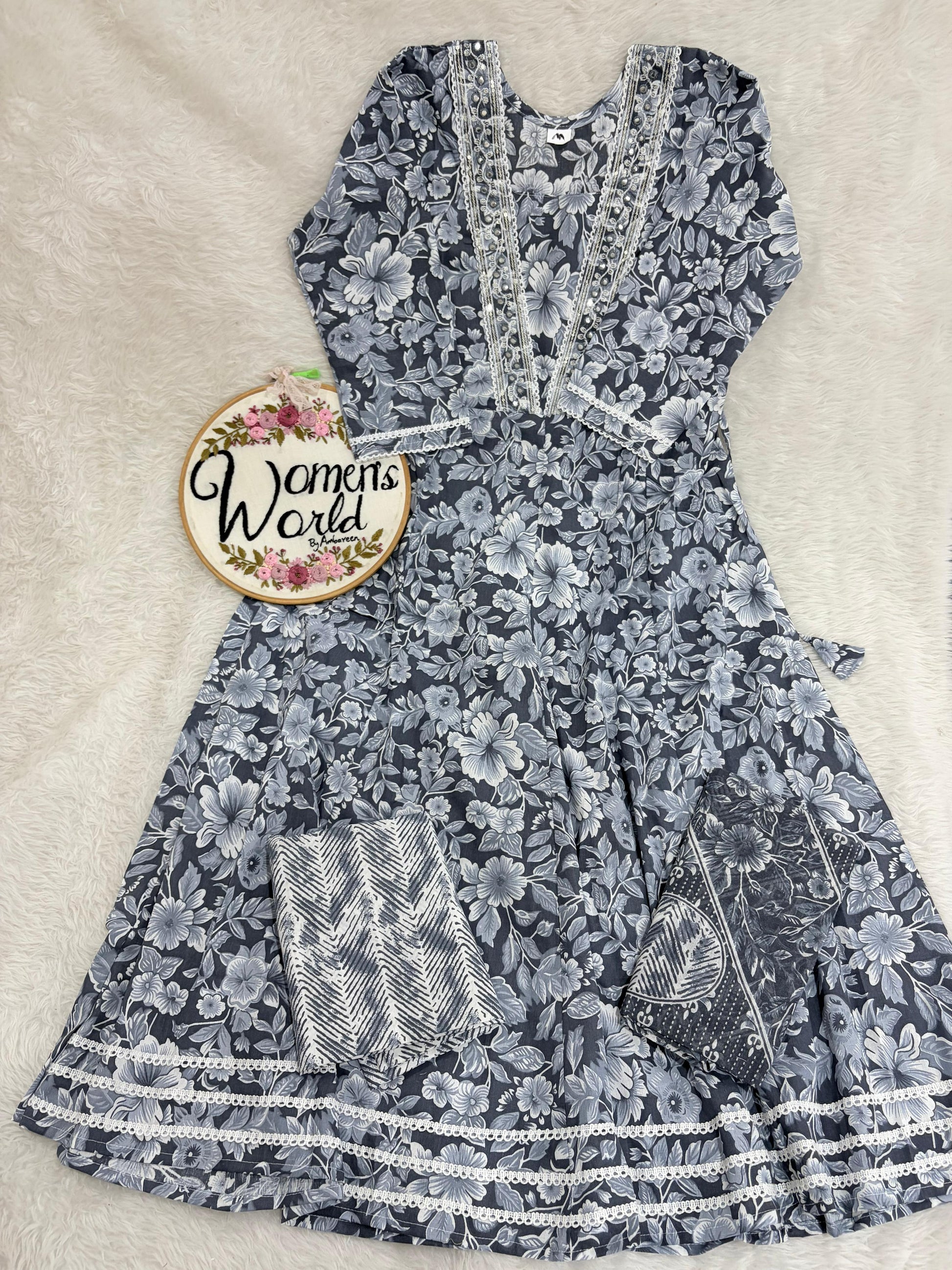 The Anarkali gown with pant and dupatta is crafted from pure cotton, ensuring breathability and comfort during long office hours. This elegant design balances traditional aesthetics with modern functionality, making it suitable for professional environments while promoting ease of movement and a polished appearance.take 1 size bigger than usual for perfect fit