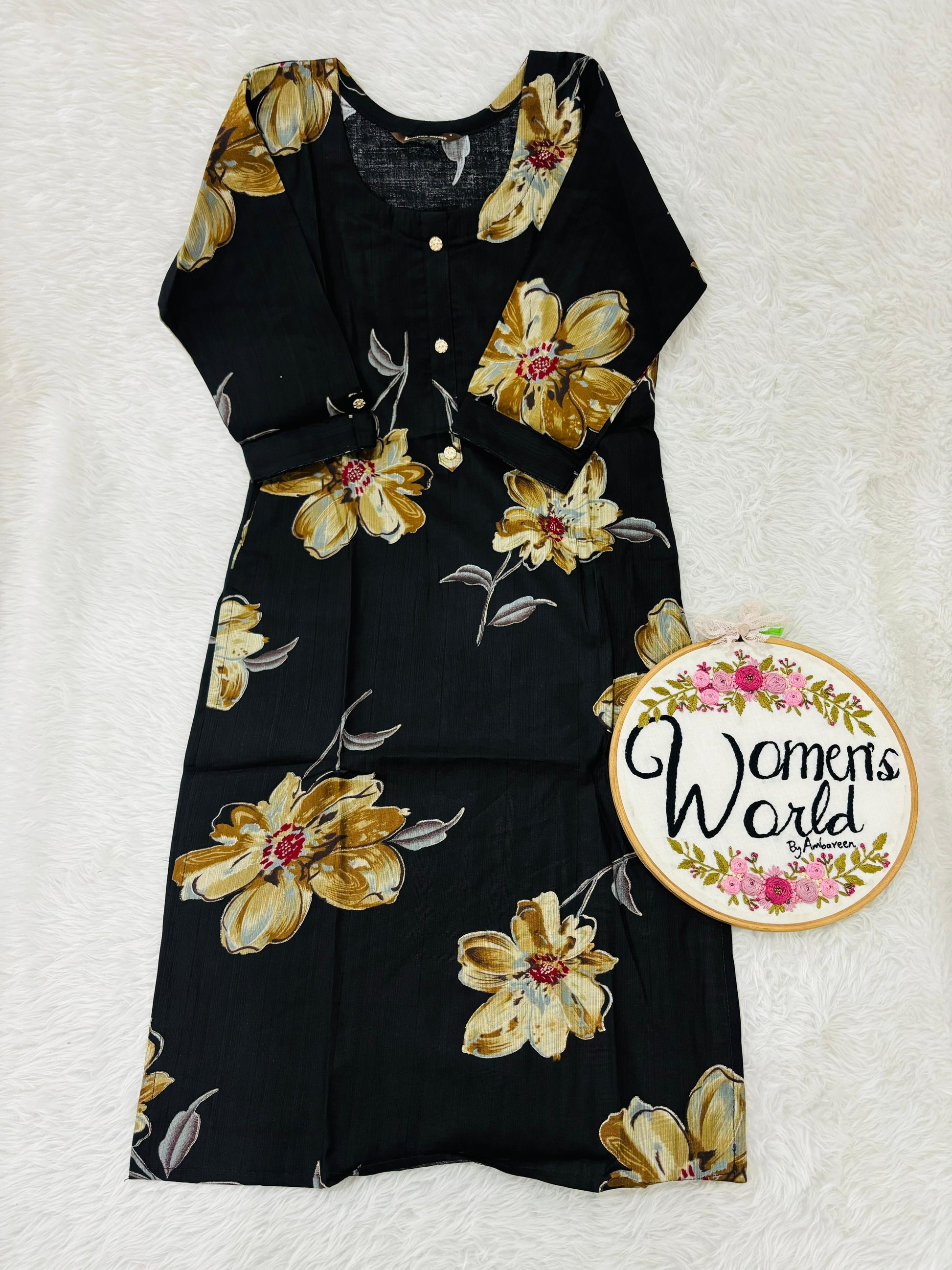Expertly crafted for a sleek and professional office look, this Branded hotblack pure vatican floral kurti is the perfect addition to your wardrobe. Made with a straight fit for a flattering silhouette, this kurti exudes elegance and style. Elevate your work attire with this must-have piece.