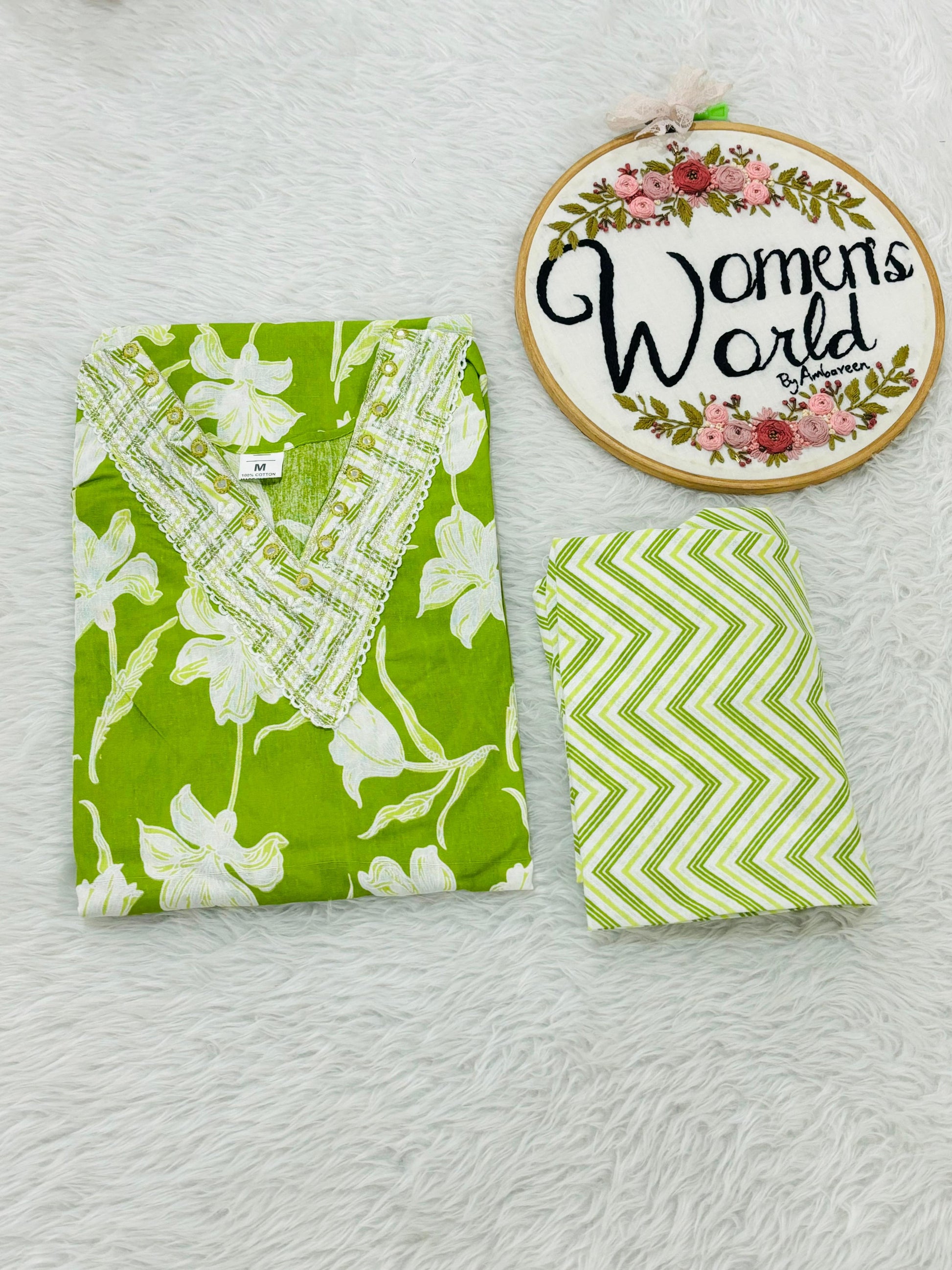 This V-neck cotton embroidered kurtipant set is both stylish and comfortable. Made of high-quality cotton, it is perfect for any occasion. With its delicate embroidery, this set is sure to turn heads. We recommend choosing one or two sizes larger for the perfect fit.